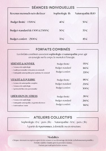 Parce que le bien-être doit rester accessible à tous, je propose une tarification ajustée selon vos revenus, en toute confiance et sans justificatif.
