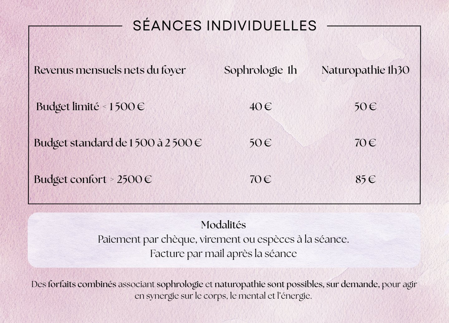 Parce que le bien-être doit rester accessible à tous, je propose une tarification ajustée à vos revenus,