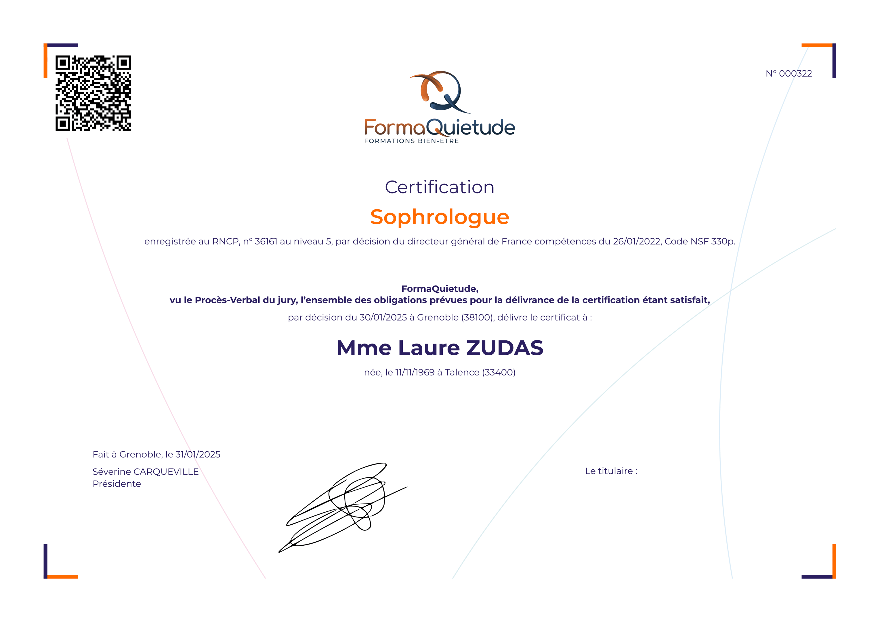 J’ai également suivi une formation rigoureuse en sophrologie, inscrite au Répertoire National des Certifications Professionnelles (RNCP) qui garantit un référentiel de compétences reconnu au niveau national.